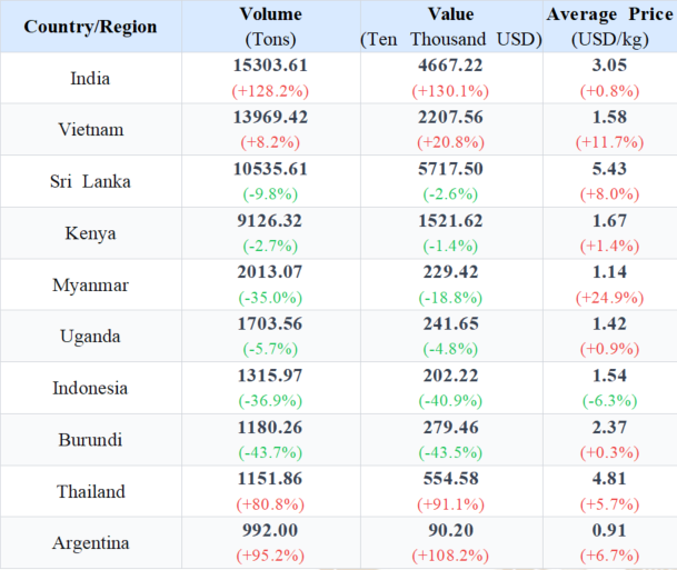 According to customs data, in 2025, Chinese mainland tea import volume was 60.8 thousand tons, with an import value of approximately 184 million US dollars, representing year-on-year increases of 12.6% and 17.2% respectively. The average price was 3.04 USD/kg, an increase of 4.1% year-on-year.